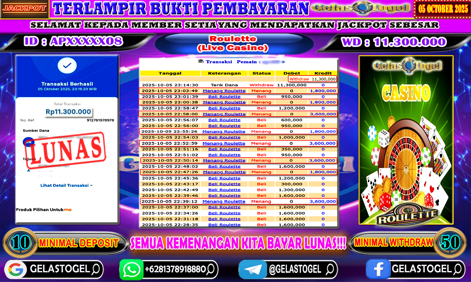 Selamat Kepada Member Setia GELASTOGEL dengan USER ID : APXXXXX08 Bukti Jackpot Live Casino Roulette Rp.11.300.000,– LUNAS langsung mendarat ke rekening tanpa bertele – tele. Terimakasih telah mempercayakan GELASTOGEL sebagai Situs Bandar Terpercaya dan Terjamin Aman! Tunggu apalagi? Daftar sekarang juga bersama GELASTOGEL dan dapatkan berbagai promo menarik setiap harinya