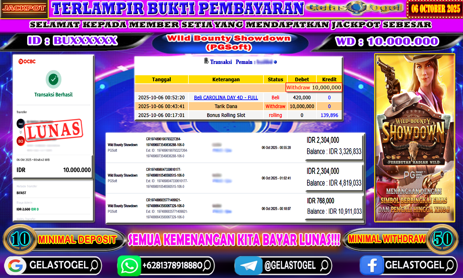 Berikut ini adalah Bukti Jackpot Togel Gelastogel 06 Ocktober 2025 yang sudah diproseskan langsung ke rekening member kami