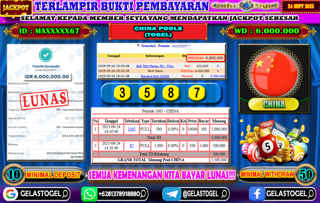 Berikut ini adalah Bukti Jackpot Togel Gelastogel 24 September 2025 yang sudah diproseskan langsung ke rekening member kami