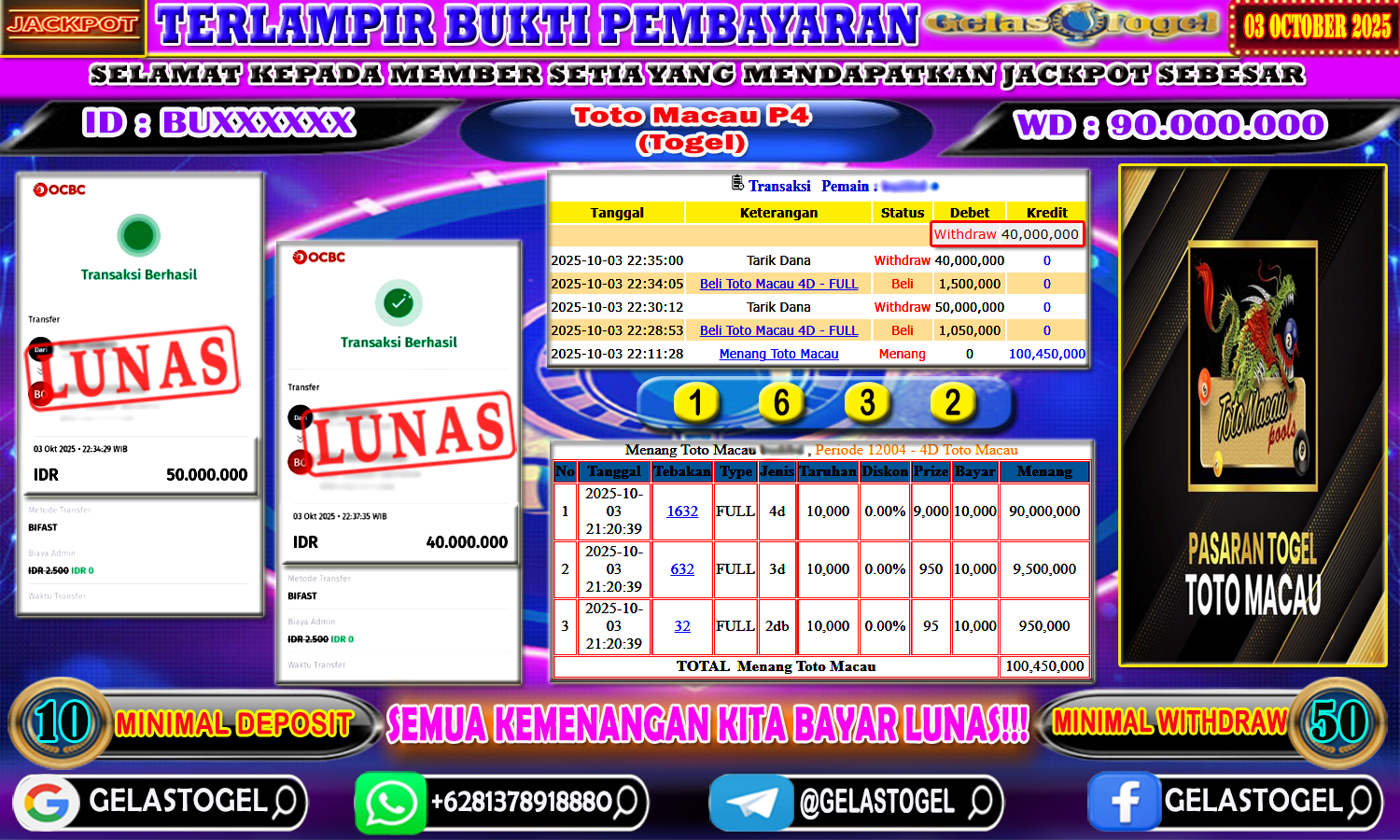 Berikut ini adalah Bukti Jackpot Togel Gelastogel 03 Ocktober 2025 yang sudah diproseskan langsung ke rekening member kami