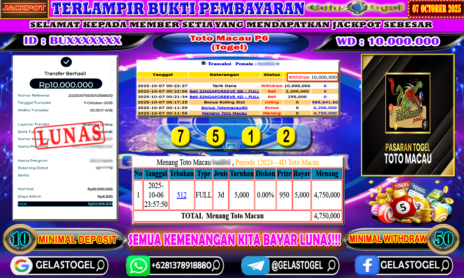 Berikut ini adalah Bukti Jackpot Togel Gelastogel 07 Ocktober 2025 yang sudah diproseskan langsung ke rekening member kami
